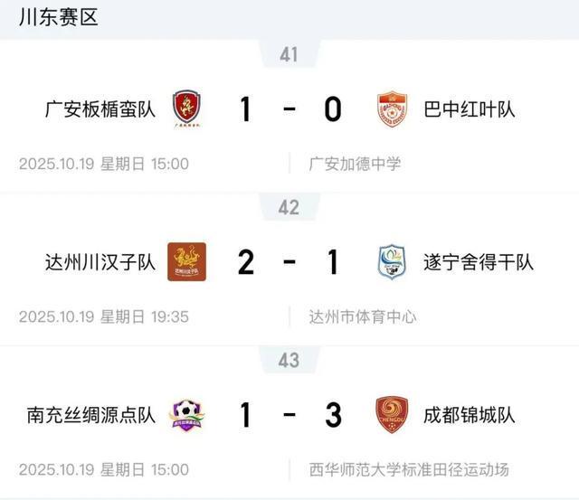 我们将为您提供川超联赛最新比赛信息!第五轮激烈角逐结束,各赛区排名已更新!本文总结了最新的赛果和积分榜,帮助您了解最新的川超联赛新闻,一起观看。 *截至10月19日,川东赛区按赛区组织。图片来源:足球中国APP(以下简称同) 广安盘城野蛮人亚中红叶队 10月19日,2025/2026四川银行四川省城市足球联赛川东赛区第五轮,广安盘城野蛮人主场迎战亚中红叶队。全场比赛结束,广安队主场1-0战胜巴中队,取得“川超联赛”开赛以来的首场胜利。 10月19日下午,南充丝源队与成都金城队比赛d 2025/2026四川东岸四川省城市足球联赛第五轮“巅峰对决”。南充丝酱队主场迎战成都金城队。当终场哨声响起时,成都队以3-1击败南充队。 10月19日晚,2025/2026四川川东银行四川城市足球联赛第五轮比赛中,达州四川汉子队与遂宁舍德队主场对阵遂宁舍德队。最终,达尔州队主场2-1战胜遂宁队。川东赛区积分榜来源:四川观察(下同)川西赛区梅山射箭队与攀枝花钢勇士队2025/2026四川银行四川省城市足球联赛川西赛区第五轮,梅山射箭队VS攀枝花队经过一番激战,比分定为 1:0。凉山市良医队雅安千奇队10月19日,凉山市好医生队在2025/2026四川银行省城市足球联赛第五轮比赛中主场迎战雅安千奇队。最终比分定为5:0。四川西部赛区资格赛 四川北部赛区 广元剑门雄关队 德阳重装队 10月18日,2025/2026四川银行四川省城市足球联赛第五轮比赛中,广元剑门雄关队主场迎战德阳重装队。当终场哨声响起时,广元剑门雄关队主场1-0战胜德阳重机。全场唯一进球是在第65分钟,光原队将前场任意球机会转化为进球。身披18号球衣的段振刚禁区抽射破门锁定胜局。阿坝县雪山雄鹰 绵阳九州长虹队 10 月 18 日 2025/2026 川行川职业赛第 5 轮四川省城市足球联赛(以下简称“川超联赛”)比赛持续激烈。来自川北阿坝县的雪山鹰队在主场茂县体育场迎战绵阳九州长虹队。比赛第83分钟,绵阳队突然中场发起进攻,迅速将球送入禁区。 30号周祝主罚破门,绵阳队1-0领先。最终,绵阳队将这一比分保持到终场,首回合全取三分。排名 川北赛区 川南赛区 资阳中国YAG队 宜宾长江首城队 10月18日下午,资阳中国YAG队在主场迎战宜宾长江首城队。上半场刚开始一分钟,宜宾队就凭借点球取得梦幻开局。最终,宜宾队5-0战胜资阳队,夺得冠军。ee 点。泸州椒香队 内江崇龙酒业队 10月18日19时35分,2025/2026“川超联赛”泸州赛区,泸州椒香队VS内江崇龙酒业队在泸州奥体公园正式开赛。加时赛第99分钟,泸州队左侧传中。 41号魏红林高高跃入禁区,头球破门。泸州队连进两球,再次追平比分。全场比赛结束,两队各得一分,最终2-2战平。且看川南赛区第六轮得分榜何时出炉!第01部川东赛区01达州VS广安 ✅比赛时间:2025年10月26日19:35 ✅比赛地点:达州体育中心 ✅比赛球队:达州四川汉子队 vs 广安半城满队 ✅门票价格:5元、10元、15元 ✅开放时间门票:10月18日14:00 ✅购票门票:四川 省观察申请者 *门票价格将在文章发表时提供。 Part.02 川西赛区 Part.03 川南赛区 Part.04 川北赛区 01 德阳 VS 甘孜 ✅ 比赛时间:2025 年 10 月 25 日 15:00(热身节目 14:30 开始) ✅ 比赛地点:德阳体育公园体育场 ✅ 比赛队伍:德阳重型装备队 VS 甘孜县有机牦牛队 ✅ 门票价格:9.9 元 ✅ 门票开始时间:第一阶段:10月19日10:00 第二阶段:10月21日10:00 ✅购票门票:四川天文台、大麦App 更多消息持续更新(成都土宝)